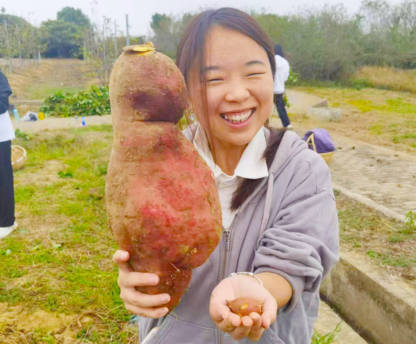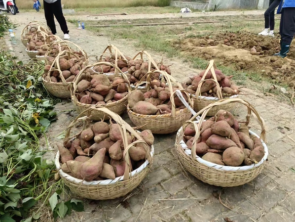 同学们拨开层叠的薯藤,轻轻挖出深藏土中的红薯,不一会儿,形态各异的“巨型薯”“爱心薯”“葫芦薯”纷纷亮相,几十筐红薯整整齐齐地码放在田间。
