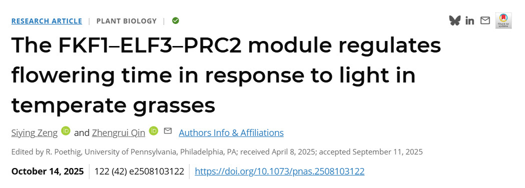 近日,sjb世俱杯官方网站草业学院秦正睿教授课题组在《美国科学院院刊》(PNAS)上发表了题为“The FKF1-ELF3-PRC2 module regulates flowering time in response to light in temperate grasses”的研究论文。该研究深入解析了光信号调控温带草类植物开花时间的分子机制及其表观遗传学基础,为今后培育高产、优质、广适的饲草品种奠定了重要理论基础。