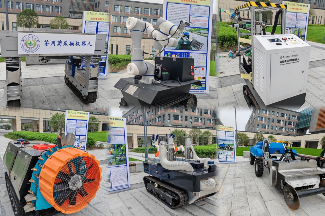 会上发布了“水田智能电动除草机”“电驱动大蒜无人播种机”“面向多场景应用的智能传感器与检测装备研发”“设施园艺分布式电驱动多功能移动作业机器人”“果园智能采摘机器人”“果园风送式施药机器人”“轻量化农情智能采集与虫害防控装备”“设施果蔬采摘机器人”等多项科技成果。会后,参会人员集体参观了科技成果展,果园智能采收机器人、双臂番茄采摘机器人、草莓采摘机器人、茶用菊采摘机器人等多款农业机器人集体亮相。