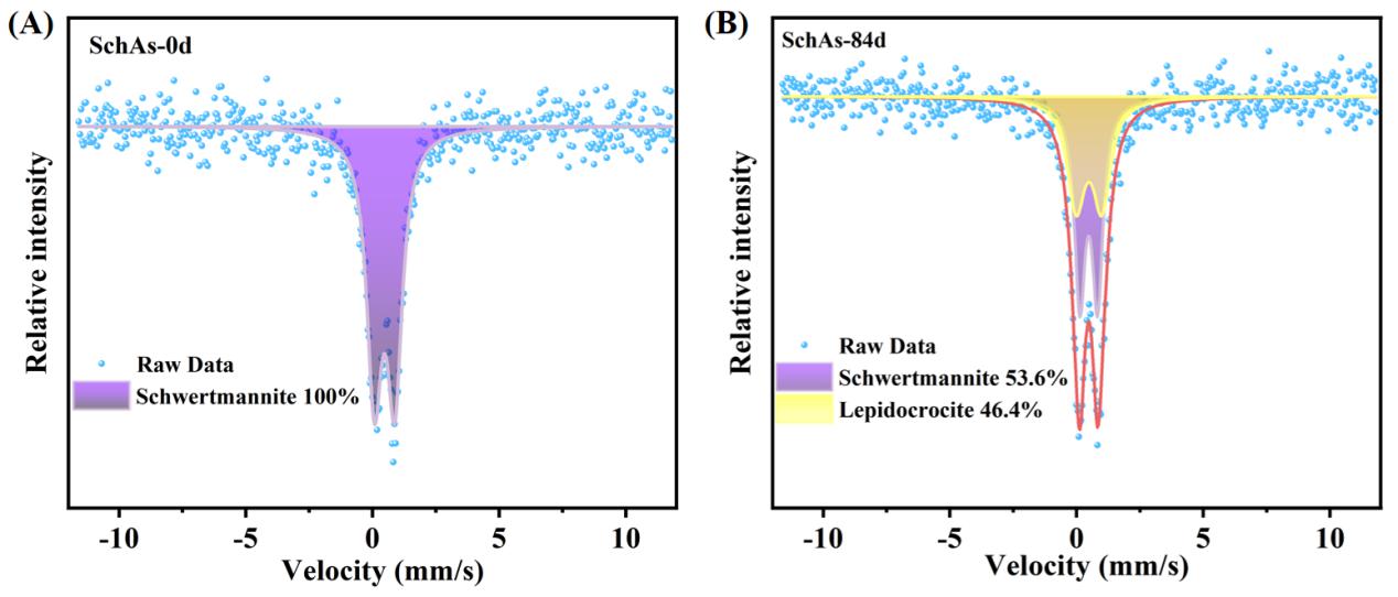 图2反应前(A)后(B)的矿物77k57Fe Mössbauer参数