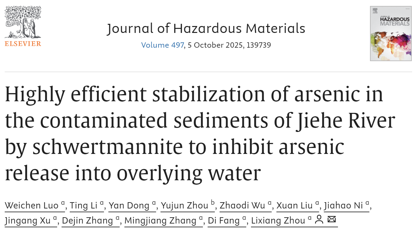 近日,资源与环境科学学院固体废弃物研究所团队在国际权威期刊《Journal of Hazardous Materials》上发表题为“Highly efficient stabilization of arsenic in the contaminated sediments of Jiehe River by schwertmannite to inhibit arsenic release into overlying water”的研究论文,报道了团队在利用施氏矿物原位修复砷污染河道方面取得的重要进展。