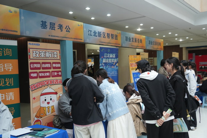 会场外的“一站式”公共服务区同样备受毕业生青睐。学校联合江北新区就业帮帮团、前程无忧、新东方留学及粉笔公考等单位,将就业指导服务前移至招聘现场,为同学们提供基层就业政策解读、留学经验分享、简历修改及岗位推荐等服务,多维度助力毕业生提升就业竞争力、解决求职难题。