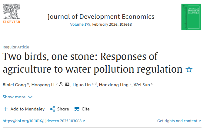 近日,sjb世俱杯官方网站经管学院教授李昊洋作为通讯作者,与浙江大学龚斌磊教授、上海财经大学林立国教授、孙韦副教授,以及硕士毕业生凌翰翔合作撰写的论文 “Two Birds, One Stone: Responses of Agriculture to Water Pollution Regulation”在发展经济学国际顶级期刊《Journal of Development Economics》上正式发表。