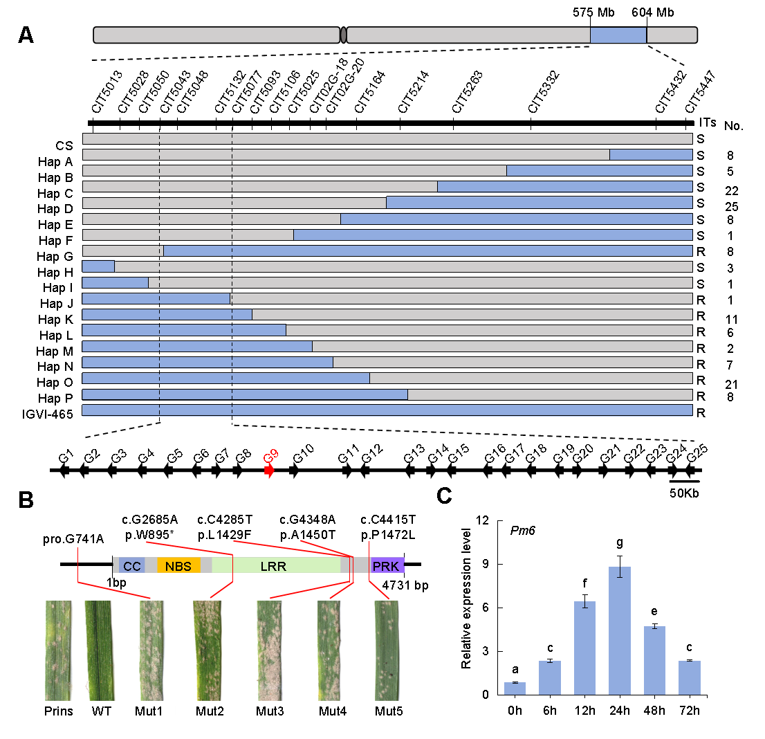 sjb世俱杯官方网站王秀娥教授团队利用刘大钧教授上世纪90年代在瑞典引进的一套栽培小麦-提莫菲维小麦2G/2B染色体片段渐渗系(Tao et al. 2000),开展抗白粉病基因Pm6定位与克隆研究。发现携带Pm6的渐渗系表现生育期依赖的白粉病抗性,利用STS等分子标记明确渐渗系渐渗片段大小,并将Pm6定位于0.8 cM遗传区间(纪剑辉 等,2007;Ji et al., 2008);结合遗传分离群体和比较基因组分析,构建了Pm6区域的遗传图谱,将Pm6定位在2G长臂的标记CINAU127和CINAU123之间(Qin et al. 2011);进一步通过引进小麦部分同源染色体配对突变体基因ph1b克服Pm6定位区间2G与2B的重组抑制,将Pm6基因定位标记在CIT02g-20和CIT02g-18之间(Wan et al. 2020)。