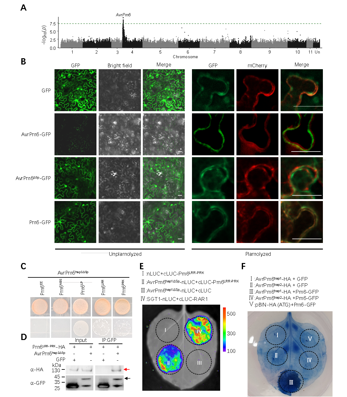 与贺飞研究员团队合作克隆了Pm6对应的病原菌效应因子AvrPm6。通过全基因组关联分析(Xie et al. 2025)将AvrPm6关联到白粉菌第4号染色体(Chr4:319,716 - 433,404)113 kb区间,其中包含6个基因(图3A)。序列分析发现,Bgt-50561具有典型的effector特征;亚细胞定位发现,成熟Bgt-50561与Pm6均定位在细胞质和细胞核中(图3B);进一步研究表明Pm6与AvrPm6存在直接互作(图3C-E),确定Bgt-50561(AvrPm6)为Pm6识别的效应因子。烟草细胞坏死实验发现,AvrPm6与Pm6共注射可以触发细胞坏死(图3F)。
