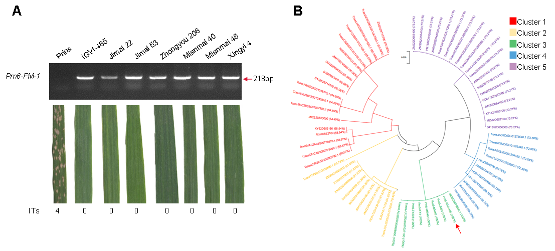 本研究开发并利用Pm6基因的功能性分子标记对小麦核心种质群体进行鉴定,发现6个品种携带Pm6基因,且均高抗白粉病(图4A)。系统进化分析显示,来自IGVI-465的Pm6序列与携Pm6的8个小麦品种(包括10+基因组中的Lancer、Julius和自然群体中的6个品种)中的Pm6序列完全一致(图4B),表明,Pm6基因在小麦育种过程中保持了编码序列完整性及抗白粉病功能。