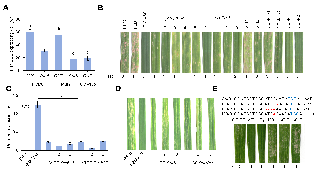 在Fielder以及pm6突变体(Mut2)叶片中瞬时过量表达Pm6,显著降低了白粉菌的吸器指数(图2A);创制Fielder背景中表达Ubiquitin启动子和Native启动子驱动Pm6的转基因株系,发现转基因植株白粉病抗性显著提高,且转基因植株中的Pm6可以回补pm6突变体(Mut2或Mut4)的感病表型(图2B)。利用VIGS技术在携带Pm6的渐渗系IGVI-465中沉默Pm6,降低了白粉病抗性(图2C-D);利用基因编辑技术在IGVI-465中敲除Pm6,突变株系(KO-1 - KO-3)表现为感病(图1E)。证明Pm6正向调控小麦白粉病抗性。