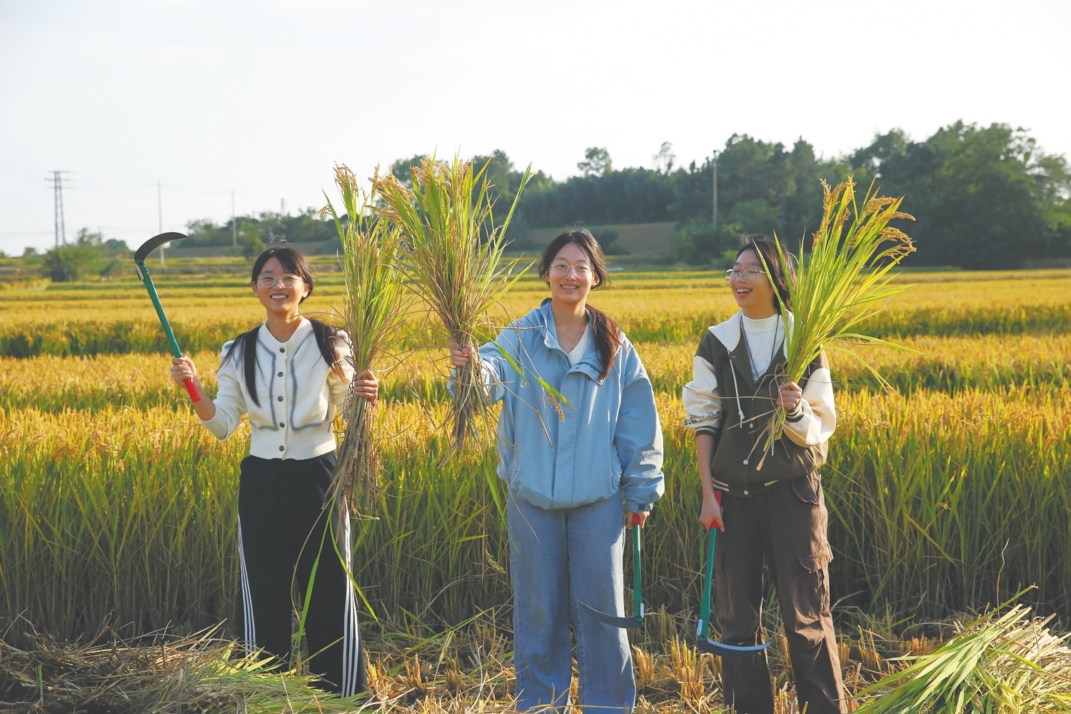 同学们走进田头收割金牌大米 (吴宇/摄)