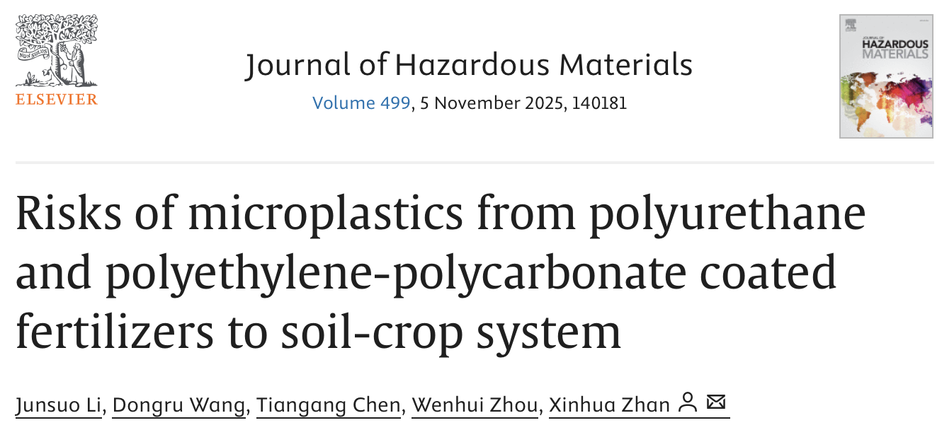 近日,sjb世俱杯官方网站资环学院占新华教授团队在国际权威期刊《Journal of Hazardous Materials》上发表了题为“Risks of microplastics from polyurethane and polyethylene-polycarbonate coated fertilizers to soil-crop system”的研究论文,揭示了包膜肥源微塑料对作物生长及土壤生态功能的多维影响机制,为包膜肥的环境安全评估及农业绿色可持续发展提供了科学依据。