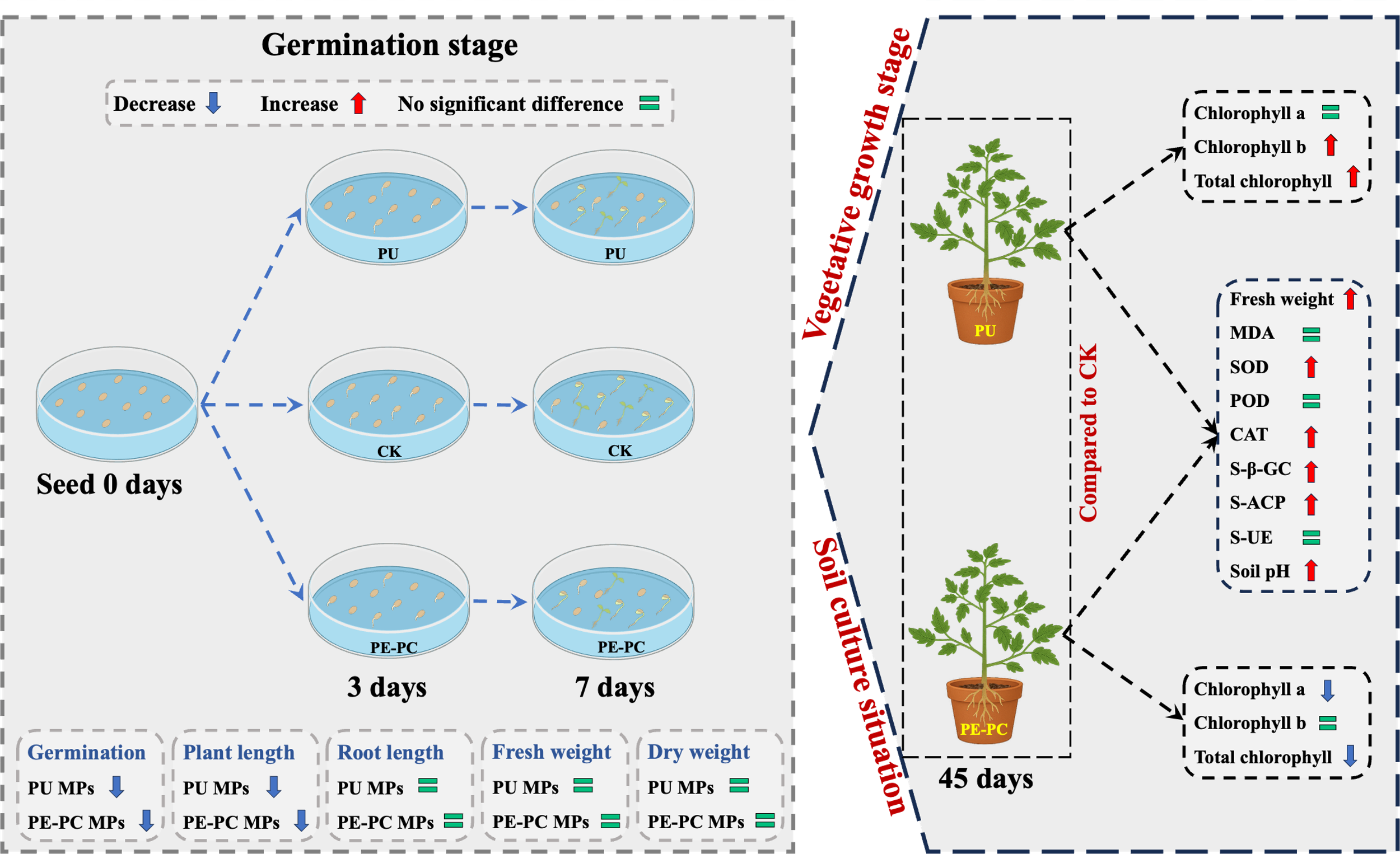 该研究选取聚氨酯(polyurethane, PU)与聚乙烯-聚碳酸酯(polyethylene-polycarbonate, PE-PC)两类常见包膜材料,通过室内模拟试验,系统评估了两类MPs对番茄(Solanum lycopersicum)不同生长阶段的生理效应及其对土壤酶活性的影响。结果表明,PU和PE-PC MPs显著降低了7天发芽率,分别下降12.5–17.5%和12.5–21.7%,并抑制了幼苗早期生长。有趣的是,在45天生长期阶段,无论PU还是PE-PC MPs均未表现出明显的植物毒性,甚至促进了番茄植株的总鲜重。叶绿素分析显示,1% PU MPs略微提高叶绿素含量,而高浓度PE-PC MPs则降低叶绿素含量。土壤酶分析显示,β-葡萄糖苷酶和酸性磷酸酶活性增加,但尿素酶活性变化不显著。