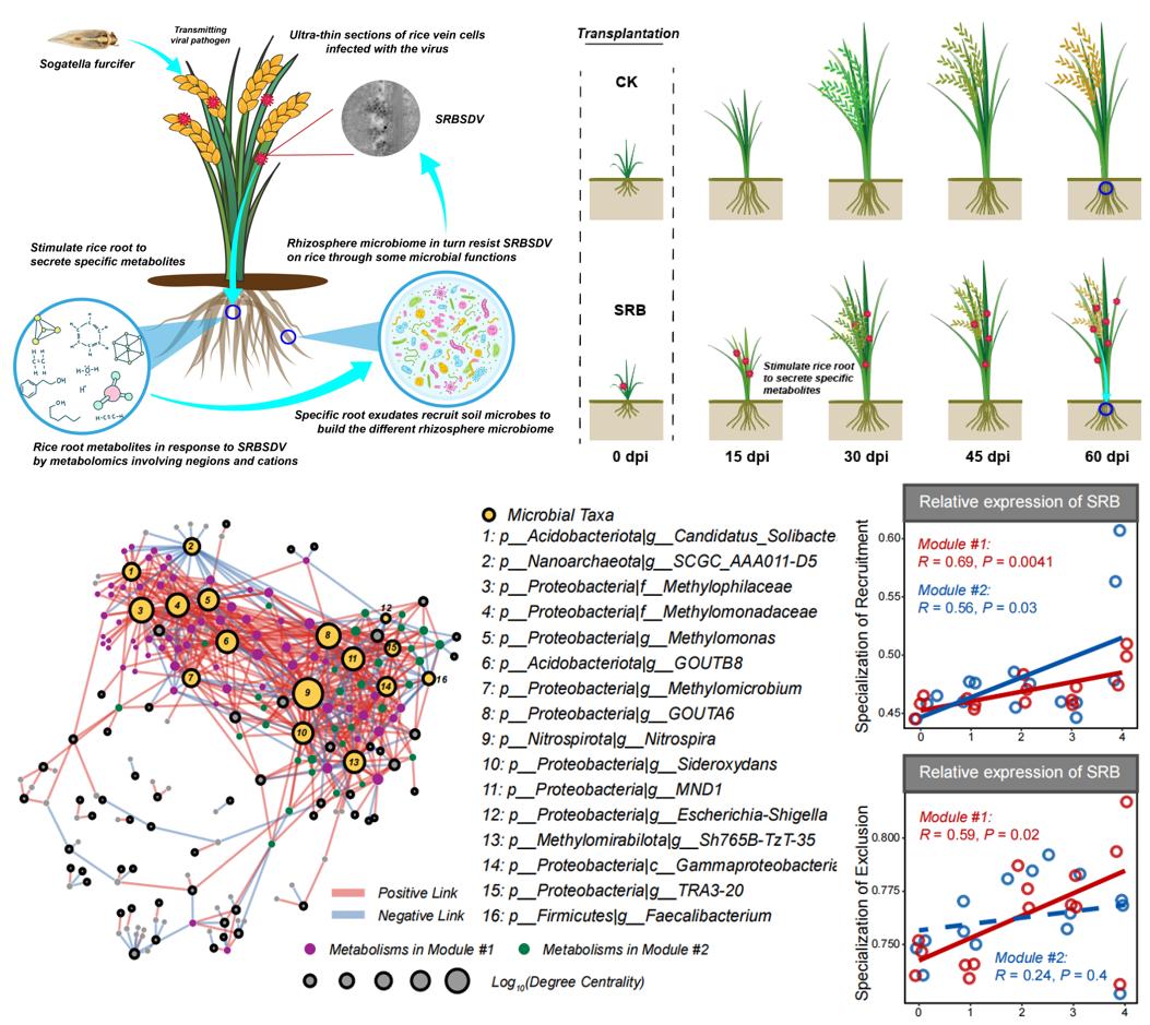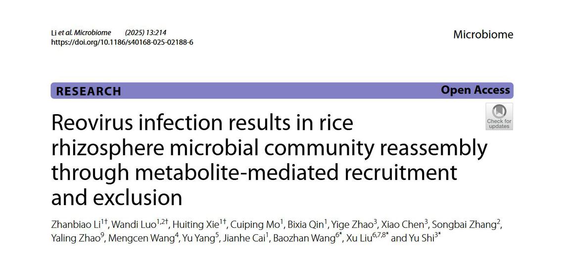 近日,sjb世俱杯官方网站生命科学学院王保战教授课题组联合河南大学、广西农科院等单位,在微生物学顶级期刊《Microbiome》发表题为“Reovirus infection results in rice rhizosphere microbial community reassembly through metabolite-mediated recruitment and exclusion”的研究论文。该研究揭示了虫媒病毒可通过调控植物根系代谢物组成,选择性招募或排斥关键微生物类群,从而重塑水稻根际微生物群落结构与功能,为通过微生物组调控提升作物健康提供了新思路。