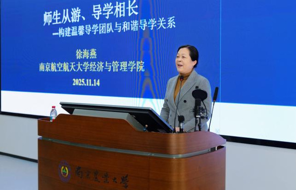 11月14日,学校首期“导学下午茶”暨研究生导师常态化培训在卫岗校区经济管理学院学术讲堂举办。特邀2025年江苏省教师年度人物、南京航空航天大学“五好导学团队”负责人徐海燕教授作《导学相长、师生从游——构建和谐导学关系和温馨导学团队》专题分享,全校100余名导师及研究生参与。