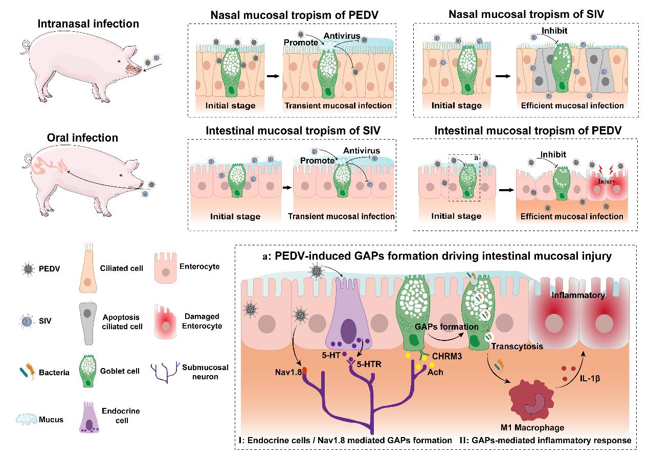 在肠道黏膜中,研究揭示了PEDV更为独特的致病机制。PEDV可通过激活黏膜下神经元的乙酰胆碱-CHRM3信号通路,诱导杯状细胞形成GAP(Goblet Cell–Associated Antigen Passage)通道。这一用于递送食物抗原、维持免疫耐受的生理通道在PEDV感染后出现“用途转移”——即便肠道上皮结构仍完整,肠道细菌也可通过GAP进入固有层,引发炎症反应,从而加剧肠道损伤并促进病毒扩增。值得注意的是,阻断CHRM3信号可显著抑制GAP形成,感染仔猪的腹泻、体重下降和组织病变均明显减轻,证明GAP在PEDV高致病性中的关键作用。