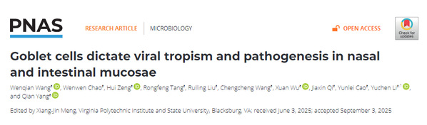 近日,sjb世俱杯官方网站动物医学院杨倩教授团队在国际著名期刊《Proceedings of the National Academy of Sciences》发表了题为“Goblet cells dictate viral tropism and pathogenesis in nasal and intestinal mucosae”的研究论文。该研究以猪流感病毒(SIV)和猪流行性腹泻病毒(PEDV)为模型,系统阐明了杯状细胞在病毒黏膜感染过程中的核心调控作用,揭示了不同黏膜组织中病毒嗜性和致病结果截然不同的关键宿主机制。
