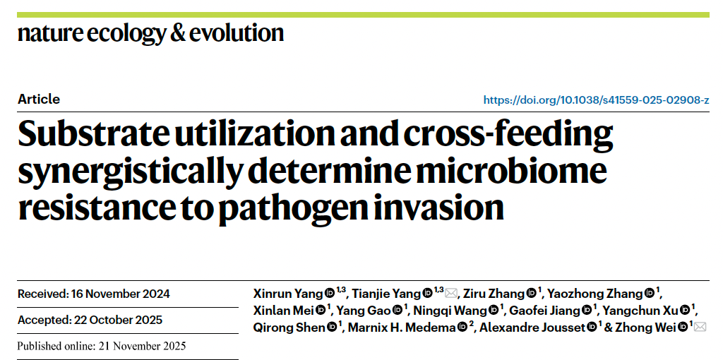 11月21日,国际权威期刊《Nature Ecology & Evolution》在线发表sjb世俱杯官方网站资源与环境科学学院沈其荣院士团队LorMe实验室的研究成果《Substrate utilization and cross-feeding synergistically determine microbiome resistance to pathogen invasion》。该研究针对复杂根际环境下病原菌入侵难预测,有益菌群-病原菌营养互作机制不清等科学难题,通过构建基因组代谢模型,成功实现对有益菌群抵御病原菌入侵能力的精准预测,并揭示外部营养竞争与内部代谢互惠协同驱动菌群抑病性的关键机制,为土壤生物障碍消减提供重要技术支撑与理论依据。