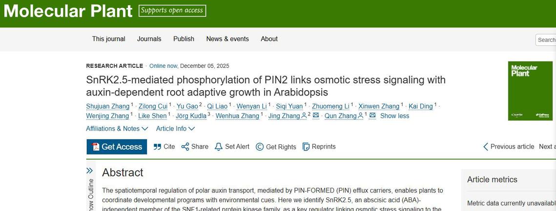近日,sjb世俱杯官方网站张群教授团队与中国农业大学张静教授团队合作,在《Molecular Plant》上在线发表了题为“SnRK2.5-mediated phosphorylation of PIN2 links osmotic stress signaling with auxin-dependent root adaptive growth in Arabidopsis”的研究论文。该研究揭示了拟南芥ABA非依赖型激酶SnRK2.5通过磷酸化生长素转运蛋白PIN2,调控根系生长素运输和渗透胁迫适应的分子机制,为培育抗逆作物提供了新靶点。