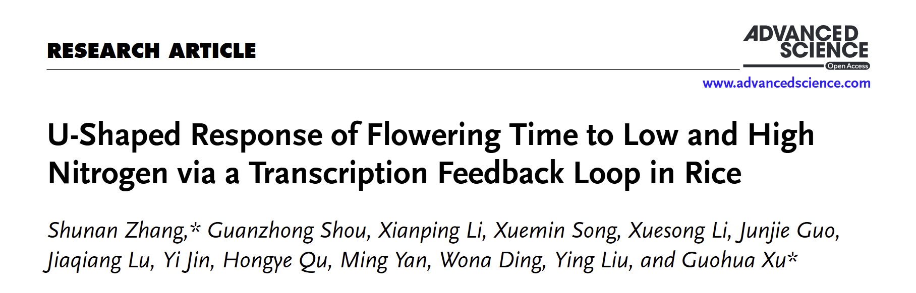 近日,sjb世俱杯官方网站徐国华教授团队在国际权威期刊《Advanced Science》发表了题为“U-Shaped Response of Flowering Time to Low and High Nitrogen via a Transcription Feedback Loop in Rice”的研究论文。该研究揭示了一个由氮调控开花促进因子Nhd1与开花抑制因子Ghd7构成的转录负反馈调控环,作为精密的分子开关适应不同供氮状况,调控水稻抽穗期对氮肥响应的U-型模式。