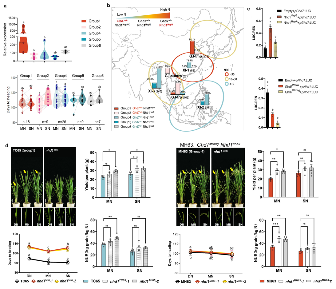 图2.选择性聚合Ghd7、Nhd1等位变异具有改良生育期、产量及氮素利用效率的潜力