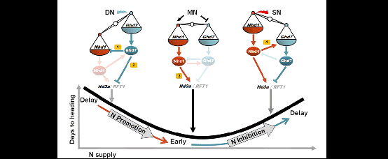 图1. Nhd1-Ghd7转录负反馈调控环介导水稻抽穗期对氮肥的U-型响应