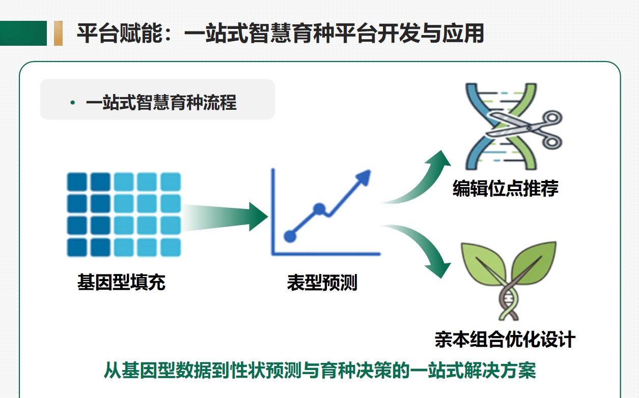 该模型首次实现了作物全生长周期的智能化模拟,整合海量基因信息、生长环境数据与动态表型组数据,打造了全新的“动态虚拟生命体”。通过构建“育种设计—田间验证—模型优化”闭环流程,预测不同环境下不同作物种质的生长和产量表现,智能识别关键基因,高效筛选优良种质,并智能生成育种优化方案。该模型破解了传统育种周期长、成本高、环境适应难控等关键瓶颈,将育种周期缩短至少50%。