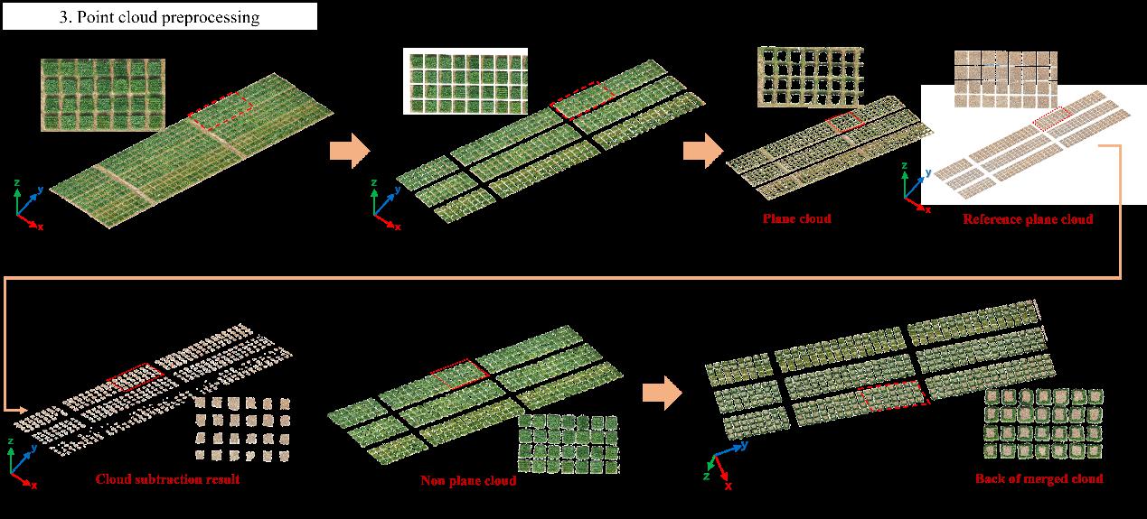 原始小麦点云中包含地块背景及噪声点云,给标注工作带来较大干扰。因此本研究开发了一套小麦小区预处理方法来获取去除地块以及噪声点的纯净小区点云数据。首先,对原始三维点云进行处理,计算x和y方向的最大最小值,并通过插值将其分割为六个氮素梯度点云,每个梯度点云包含160个小区的三维数据。根据品种分布,采用不同的插值分割策略,将每个梯度点云精确划分为160个独立的小区点云,最终获得960个小区样本。然后,通过平面拟合去除地面点云,避免对边界框中心坐标的干扰。考虑到冠层遮挡问题,创新性地通过基准面点云与地面差值运算,获取缺失的下部地面信息,并与处理后的小区点云融合,经半径滤波去噪,得到完整的小麦小区点云。