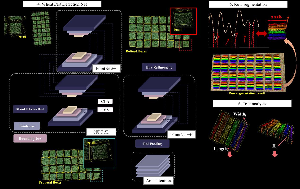 为解决上述问题,本研究团队基于三维目标检测网络与动态时空表型构建了小麦全生育期产量分级与预测的新型框架,系统性地提升了小麦全生育期三维表型自动化分析与产量预测的精度与效率。该框架包含五个主要创新点:(1)提出三维基准面辅助的小区分割算法,实现高效点云提取与检测框快速标注,提升前期预处理效率。(2)构建了融合三维跨层特征金字塔网络(CFPT 3D)与空间注意力模块(AATT)的3D Wheat Plot Detection Net,显著增强模型在深度特征识别和候选框关键特征提取方面的能力,兼具更优的精度与训练效率。(3)创新利用点云密度空间分布实现行级点云分割,为独立计算行级表型参数提供基础。(4)开发3D Wheat Plot Phenotype Extraction软件,集成三维可视化与静态、动态表型自动提取,实现从点云处理到表型输出的全流程自动化。(5)构建动态表型预测体系,根据小麦不同生育时期的静态表型及产量数据对长势进行分级,并提出性状快速变化期、缓慢变化期、降低期、最大高度/面积差及高度面积变化率五类动态时序表型,结合机器学习实现长势分级与产量预测。