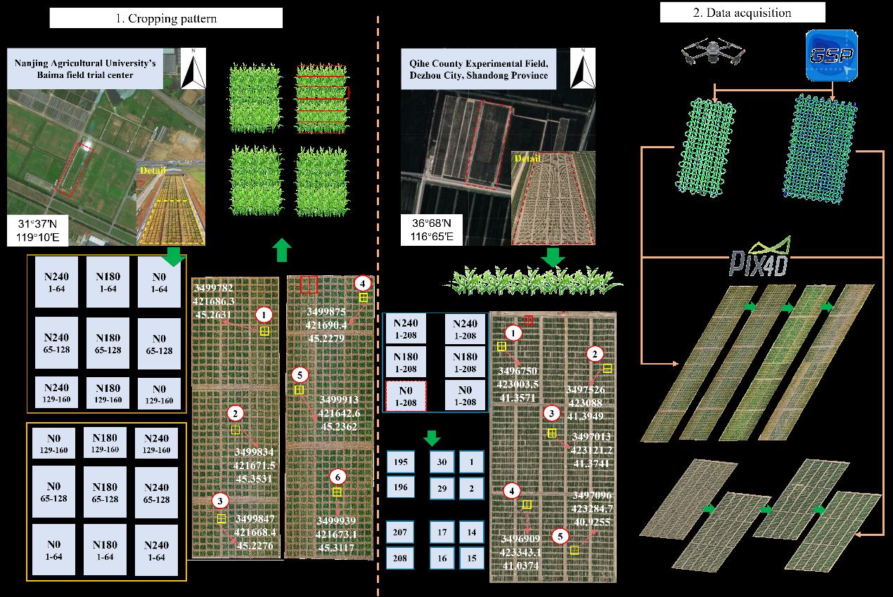 本研究选取长江中下游及黄淮海平原地区的160个自然小麦品种,在sjb世俱杯官方网站白马教学科研基地(31°36′57.8″N,119°10′46.1″E)开展田间试验。针对每个品种,设置三个氮肥梯度处理:零氮肥N0、中等氮素肥量N180以及较高氮素肥量,每个处理设置两个生物学重复,总计960个试验小区。对于每个1.5m × 1.5m的种植小区,团队采用行间距25cm,每行均匀种植约100株,行数为6行的种植方式种植每个小麦品种。同时,为了测试本研究构建的三维检测模型的泛化性,在山东省德州市齐河县(36°68′N, 116°65′E)对江中下游及黄淮海平原地区的208个自然小麦品种也进行了田间试验。同样设置三个氮肥梯度,每个氮肥梯度设置五个对照组,总计15个地块,每个地块的种植模式采用1.5m × 0.4m单行种植。