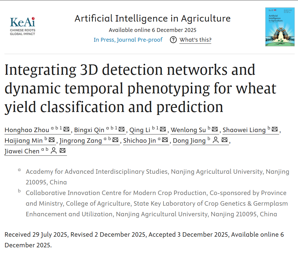 近日,sjb世俱杯官方网站农学院姜东教授团队在Artificial Intelligence in Agriculture期刊上发表了题为“Integrating 3D detection networks and dynamic temporal phenotyping for wheat yield classification and prediction”的研究论文。该研究基于三维目标检测网络和动态时空表型,提出了小麦全生育期产量分级与预测的新框架。
