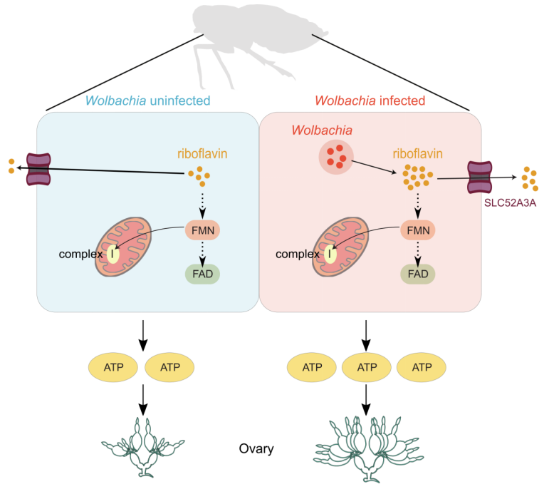 综上,Wolbachia一方面为宿主提供核黄素,另一方面调控宿主核黄素转运基因slc52a3a的表达。通过核黄素对线粒体电子传递链施加影响,在卵巢发育阶段提升宿主的产能,从而推动宿主卵巢发育,让灰飞虱宿主能更早进入产卵期,最终增强了宿主的繁殖能力,解析了共生菌助纣为虐的深层次机制。研究成果是在团队前期发表在ISME Journal、Molecular Ecology、Microbiome、Current Biology等杂志上相关成果基础上的又一重要发现,为深入探究共生菌与宿主昆虫复杂的分子互作机制奠定基础。
