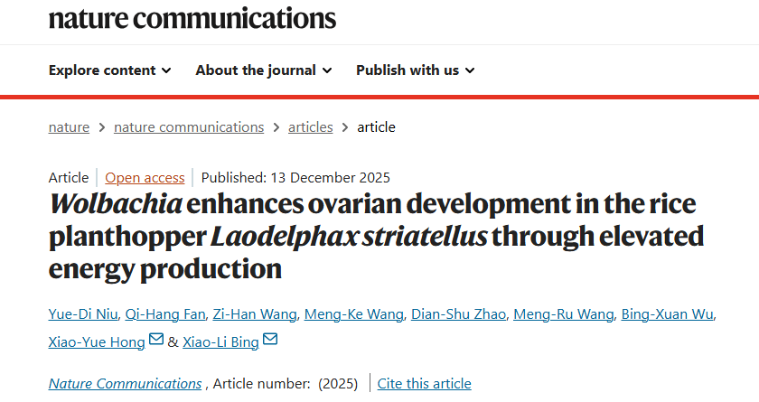 近日,sjb世俱杯官方网站植物保护学院洪晓月教授团队在国际权威学术期刊《自然・通讯》(Nature Communications)发表了题为 “Wolbachia enhances ovarian development in the rice planthopper Laodelphax striatellus through elevated energy production”的研究论文,深入解析内共生菌Wolbachia(沃尔巴克氏体)通过合成核黄素来调控宿主能量代谢,进而加速卵巢成熟、增强宿主繁殖力的分子机制。研究明确了营养供给在内共生关系维持中的关键作用,为进一步理解内共生菌与宿主间的代谢互作提供了全新视角。