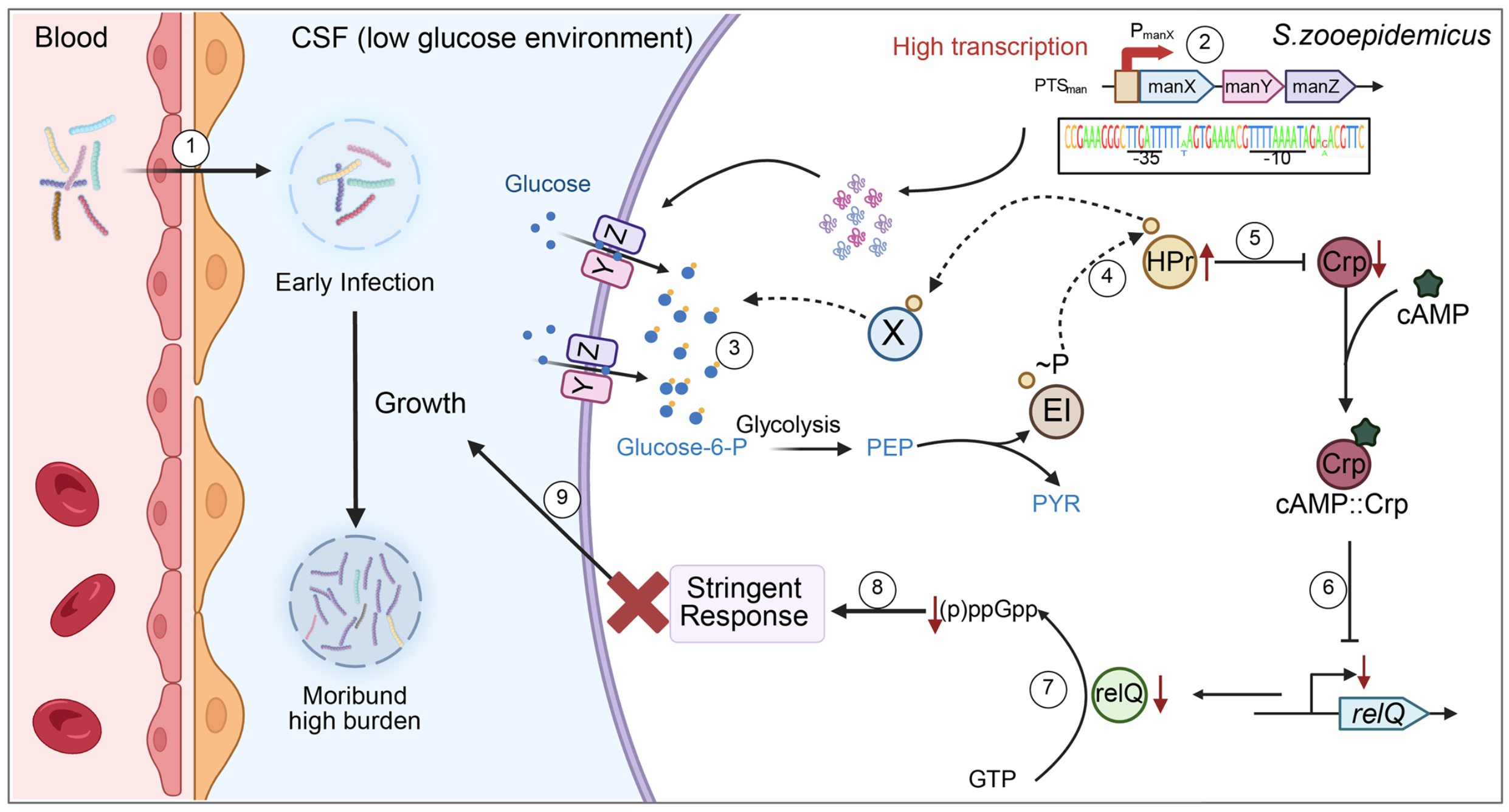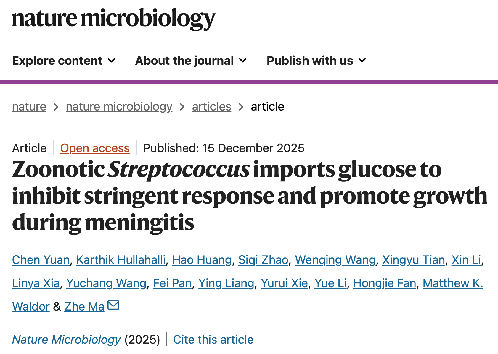 近日,sjb世俱杯动物医学院范红结教授团队马喆教授课题组联合哈佛大学医学院Matthew K. Waldor教授实验室,在国际知名期刊《Nature Microbiology》上发表题为“ZoonoticStreptococcus imports glucose to inhibit stringent response and promote growth during meningitis”的研究论文。研究揭示人兽共患猪链球菌病重要病原兽疫链球菌(也称马链球菌兽疫亚种,Streptococcus equi subsp.zooepidemicus)利用持续转录的葡萄糖转运磷酸转移酶系统(phosphotransferase system, PTS)在低糖环境下避免陷入严紧反应并维持增殖的代谢适应机制,为预防和治疗脑膜炎型猪链球菌病提供了新的理论基础。