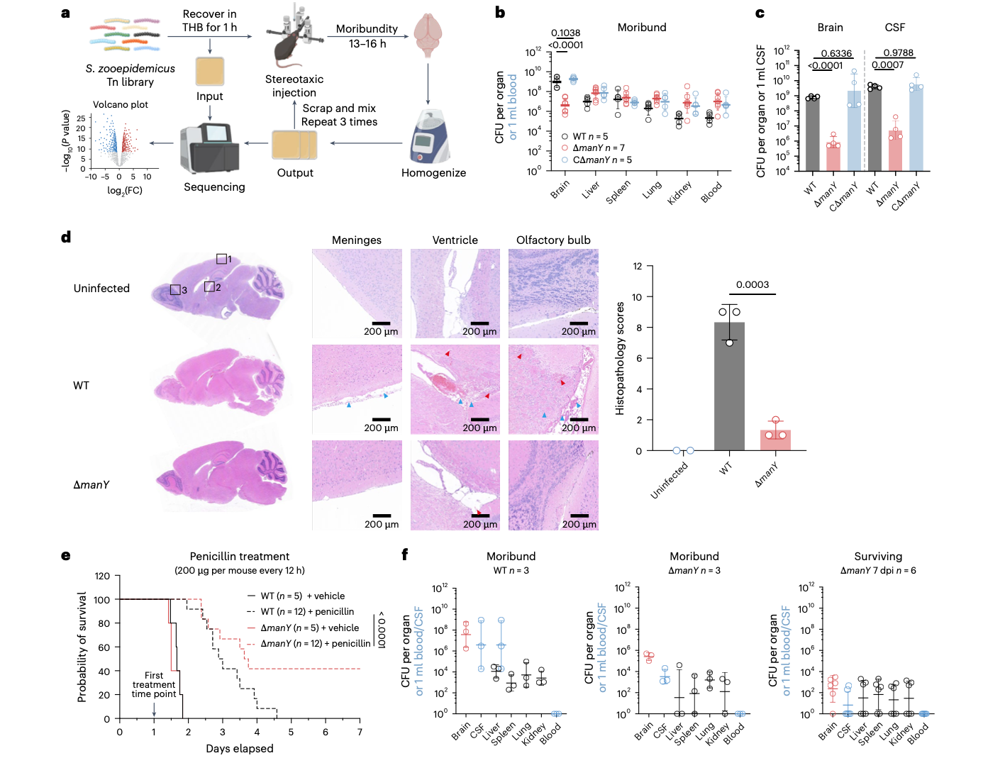 兽疫链球菌是一种重要的人兽共患病原菌,常引发宿主脑膜炎。感染猪只一般在出现神经症状数小时内死亡,治疗窗口短,致死率高。本研究基于兽疫链球菌脑部感染模型,发现病原主要定殖于宿主富含脑脊液的脑室中,并在其中大量增殖,形成高载量感染灶。通过转座子突变体文库筛选,发现细菌PTS是兽疫链球菌在脑脊液中适应性增殖的关键因子。造成该PTS系统瘫痪可以有效降低兽疫链球菌在宿主大脑的增殖水平,减弱对大脑造成损伤的同时促进抗生素控制外周感染的治疗效果,提高存活率。