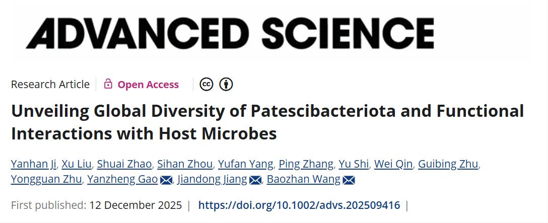 近日,sjb世俱杯官方网站生命科学学院蒋建东教授、王保战教授团队联合资源与环境科学学院高彦征教授团队,在《Advanced Science》发表了题为“Unveiling Global Diversity of Patescibacteriota and Functional Interactions with Host Microbes”的研究性论文。该研究建立了基于核糖体蛋白S3(rpS3)的系统发育分析新框架,绘制了超微细菌Patescibacteriota的全球分布图谱,并揭示了Patescibacteriota通过协同代谢增强宿主环境适应性并参与全球生物地球化学循环的生态学新机制。