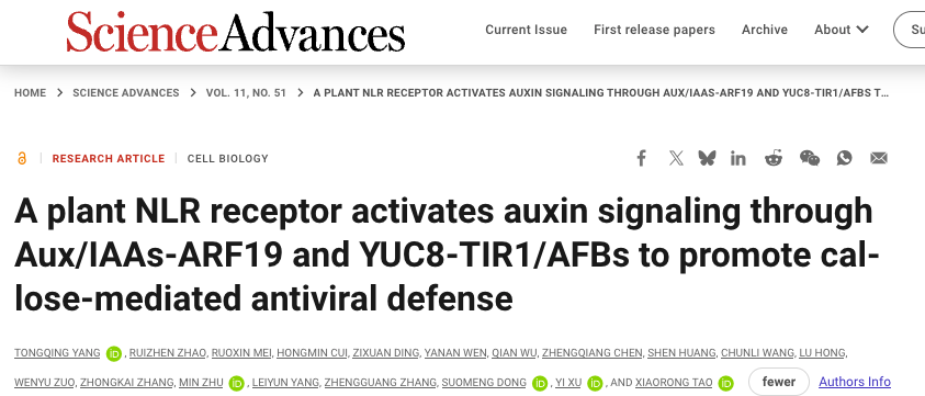 近日,sjb世俱杯官方网站植物保护学院陶小荣教授团队在国际权威学术期刊《科学·进展》(Science Advances)在线发表了题为A plant NLR receptor activates auxin signaling through Aux/IAAs-ARF19 and YUC8-TIR1/AFBs to promote callose-mediated antiviral defense的研究论文。该研究揭示了NLR免疫受体Sw-5b通过Aux/IAAs-ARF19与YUC8-TIR1/AFBs模块启动和放大生长素信号通路进而促进胼胝质介导的抗病毒免疫的机制。