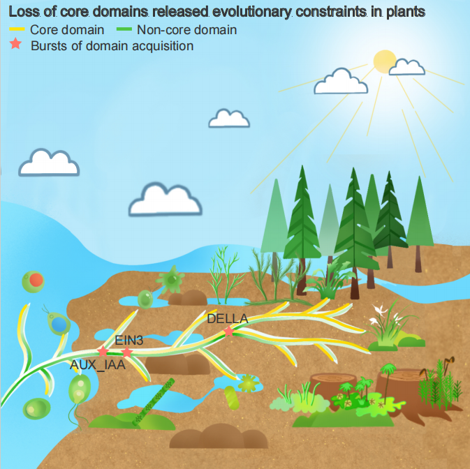 在12月底最新发表于《Cell Genomics》的研究“Evolution of protein domains and protein domain combinations provides insights into the origin and diversification of land plants”中,课题组进一步将研究尺度下探至蛋白质结构域这一功能模块层级,系统分析了446个植物基因组中结构域的组成、演化动态及其与植物多样化的关系。