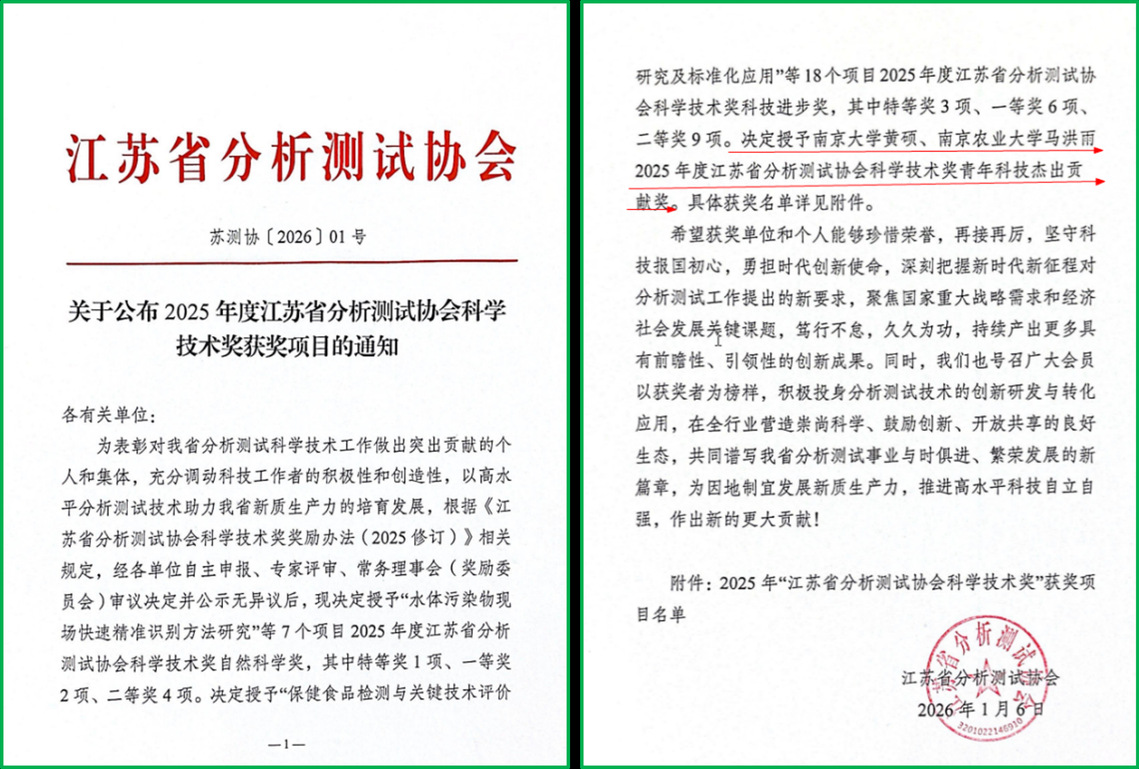 近日,江苏省分析测试协会公布了2025年度科学技术奖获奖名单,sjb世俱杯现代农业分析测试中心教授级高级实验师马洪雨荣获江苏省分析测试协会科学技术奖“青年科技杰出贡献奖”。