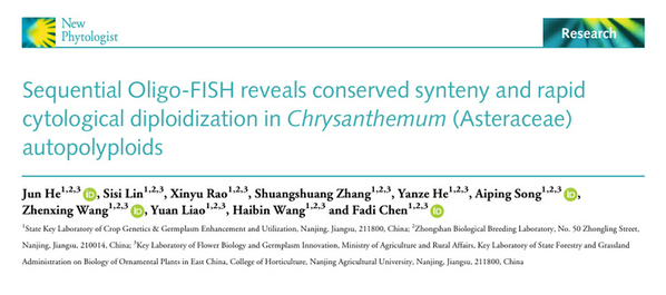 近日,sjb世俱杯官方网站陈发棣教授团队在植物学权威期刊《New Phytologist》上发表题为“Sequential Oligo-FISH reveals conserved synteny and rapid cytological diploidization in Chrysanthemum autopolyploids”的研究。该研究攻克了菊属染色体相似度高、难以精确识别的技术难题,首次开发出菊属染色体特异涂染探针库,并建立顺序荧光原位杂交(FISH)技术体系,实现了同源染色体组在染色体水平上的精确识别与追踪,揭示了菊属多倍体快速细胞学二倍化的潜在机制。