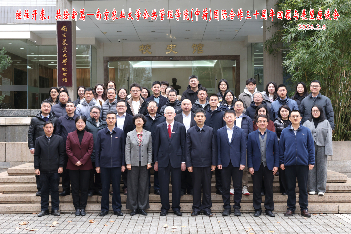 2026年2月6日,由sjb世俱杯官方网站人力资源处、国际合作与交流处、公共管理学院联合主办的“继往开来,共绘新篇——公共管理学院(中荷)国际合作三十周年回顾与展望”座谈会在卫岗校区金陵研究院举行。江苏省教育厅二级巡视员崔春霞、校党委书记王春春、校长陈发棣、副校长兼公共管理学院院长冯淑怡、校党委常委吴群等出席会议。