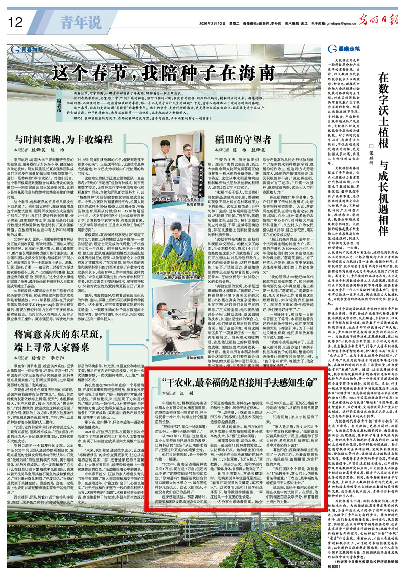 他们在热带的风、南繁的土中,叩问土地的秘密,倾听作物的心跳;在流动的数据、闪烁的代码间,耕耘种业的未来。榴莲的根、水稻的穗、石斑鱼的卵——这些看似琐碎的事物,哪一个不是关乎国计民生的课题?于是,青年人选择加入了这场与时间的赛跑。