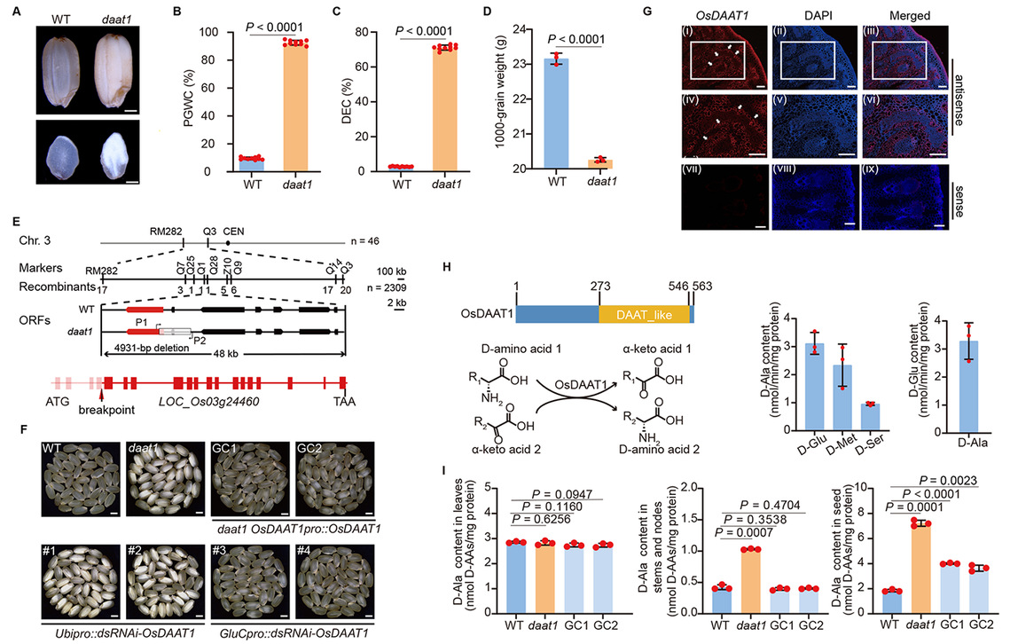 研究团队通过图位克隆和遗传互补实验,成功分离并鉴定了一个调控水稻垩白形成的关键基因OsDAAT1。该基因编码D-氨基酸氨基转移酶,在水稻节间维管组织中高表达,能够在体外催化不同D-氨基酸之间的相互转化。遗传分析表明,daat1突变体中D-丙氨酸在茎秆、节部及发育籽粒中显著积累,说明该基因在维持D-氨基酸稳态方面发挥重要作用。