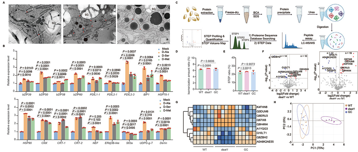 研究发现D-氨基酸稳态的变化导致了严重的内质网胁迫,体外蛋白翻译实验表明D-氨基酸能够参与新生多肽的合成。因此,研究团队推测D-氨基酸稳态变化可能影响新生多肽/蛋白质异构化水平,但在生物体内尚缺乏有效的检测手段。通过与南开大学李功玉教授团队合作,首次在植物中系统开展了蛋白质异构化修饰的鉴定工作,证实水稻胚乳中肽链/蛋白质确实存在一定比例的异构化修饰。进一步比较发现突变体中肽链/蛋白质异构化水平显著改变,多个直接参与淀粉和贮藏蛋白生物合成的关键酶类蛋白发生构象异常。这些研究表明D-氨基酸代谢失衡导致蛋白质异构化修饰改变,进而通过诱发严重的内质网(ER)胁迫反应,干扰新合成蛋白的正常折叠与贮藏物质的沉积,最终导致籽粒垩白显著增加。