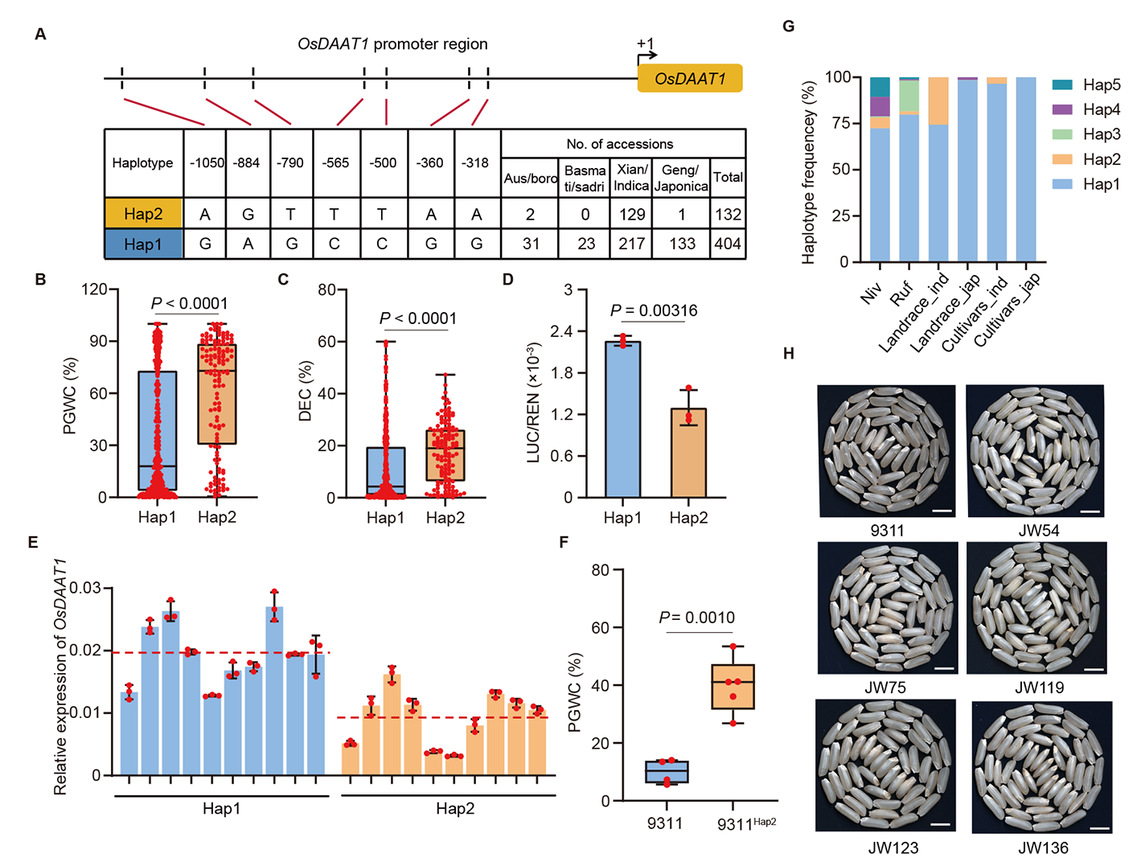在育种应用层面,研究团队鉴定到OsDAAT1Hap1为低垩白优异单倍型,携带OsDAAT1Hap1的自然品种和置换系均表现为更低的垩白。群体遗传分析显示,该基因在水稻驯化过程中可能经历了人工选择。该发现为通过分子设计育种改良稻米外观品质提供了重要的功能等位基因资源。