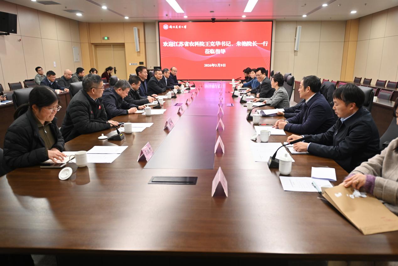 3月9日下午,江苏省农业科学院党委书记王克华,院长朱艳,党委副书记黄俊,副院长孙洪武、王冉、陈新来校调研。校党委书记王春春,校长陈发棣,校党委副书记江嵩、刘营军、吴荣顺,副校长丁艳锋、王源超、冯淑怡参加座谈交流。