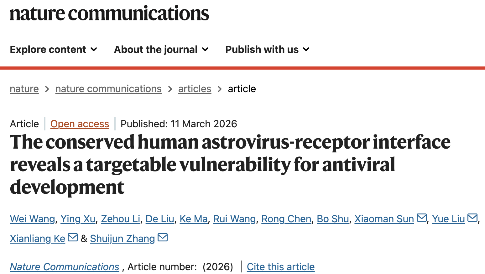 3月11日,sjb世俱杯官方网站生命科学学院张水军教授团队在《Nature Communications》期刊在线发表了题为“The conserved human astrovirus-receptor interface reveals a targetable vulnerability for antiviral development”的研究论文。该研究首次解析了人星状病毒8型(HAstV8)刺突蛋白与FcRn受体的复合物晶体结构,揭示了经典人星状病毒识别受体的保守分子机制,发现三款临床已获批的FcRn阻断剂能够通过竞争受体结合有效抑制星状病毒感染,有望通过“老药新用”的策略用于星状病毒治疗。