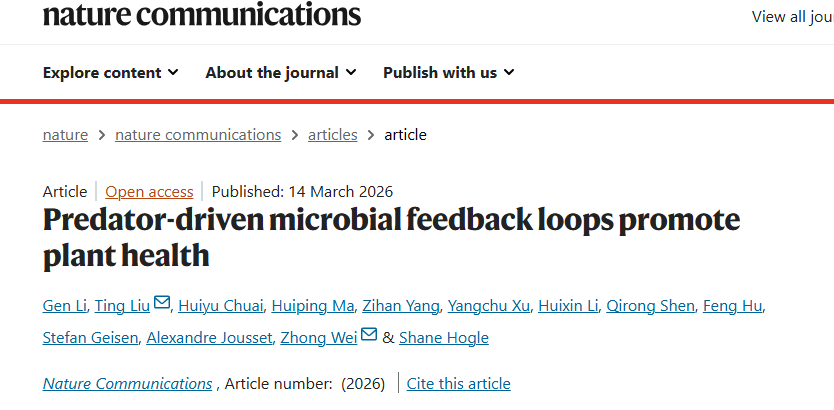 此前,团队于2026年1月30日在《The ISME Journal》发表题为“Pseudomonadota bridge cross-trophic interactions to suppress plant pathogens”的研究论文,发现变形菌门细菌是连接土壤动物线虫与根际微生物互作、并参与抑制植物病原菌的关键桥梁类群,揭示了跨营养级互作在根际病害防控中的重要作用。在此基础上,发表于《Nature Communications》的这项研究进一步表明,线虫这类土壤动物的捕食压力不仅能够塑造根际微生物群落组成,还有助于维持功能互补、协同性更强的有益菌群,从而增强微生物组抵御病原入侵的稳定性。与仅接种根际微生物的处理相比,这种由捕食压力驱动形成的菌群更不易在病原菌入侵下失稳,因而能够使有益菌株对病原菌的抑制作用更加持久。