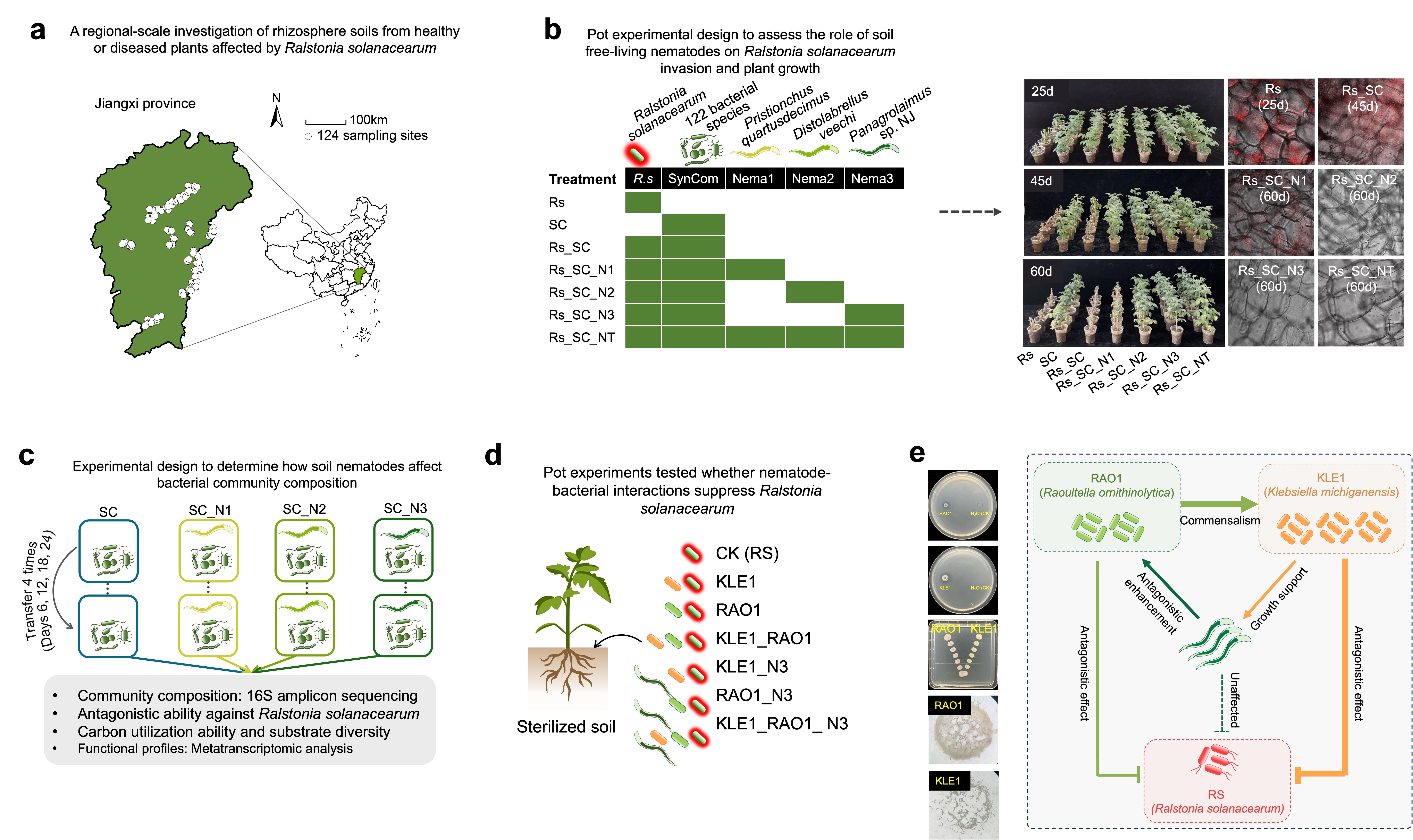 研究发现,野外调查发现健康植物根际土壤中细菌-线虫互作网络的负相关性显著强于发病土壤;温室盆栽实验证实,添加食细菌线虫可显著降低青枯菌丰度并阻控病害发生;微宇宙培养结合宏转录组分析揭示,线虫通过捕食作用重塑合成菌群结构,增强微生物群落抗生素合成和碳源利用能力;进一步的物种互作实验表明,线虫调控关键抑病细菌KLE1和RAO1形成正向反馈环,并协同增强对青枯菌的抑制效果。该机制在盆栽实验中得到验证,表明食细菌线虫作为“土壤微型生态工程师”,通过多营养级互作激活微生物抑病功能,为作物保护提供了新的微生态视角。