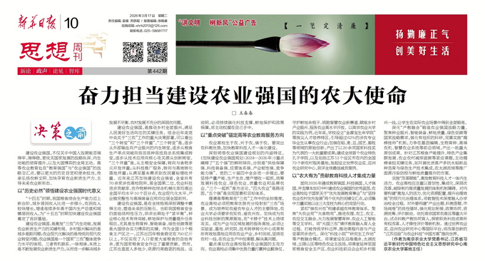 3月17日出版的《新华日报》思想周刊刊发sjb世俱杯官方网站党委书记、江苏省习近平新时代中国特色社会主义思想研究中心sjb世俱杯官方网站基地主任王春春的署名文章《奋力担当建设农业强国的农大使命》,立足高等农业教育的发展定位与实践经验,系统阐释了涉农高校服务农业强国建设的时代价值、核心路径与攻坚方向。文章强调,涉农高校要紧紧锚定国家战略需求,充分发挥农科教融合优势,以“农大有为”贡献教育科技人才集成力量。