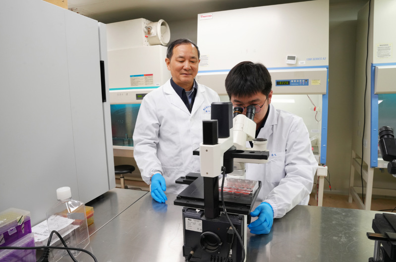 范红结(左)教授指导团队研究人员进行胞内劳森菌分离培养