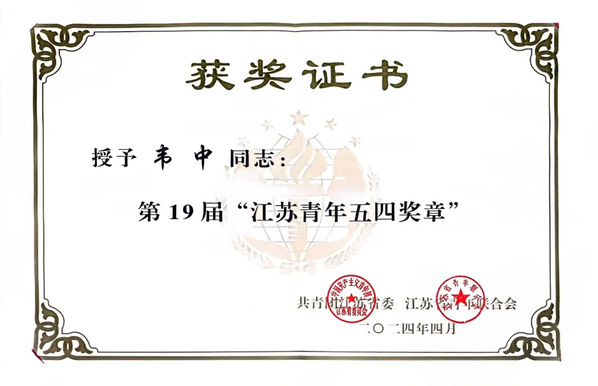 教师党员韦中获第19届“江苏青年五四奖章”