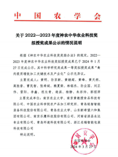 3. 研发出猪胴体分级分割新工艺和立式智能化新装备“高端生鲜猪肉智能化加工关键工艺技术集成及产业化示范”,实现了全自动零损耗切割,入选2024年农业农村部主推技术。